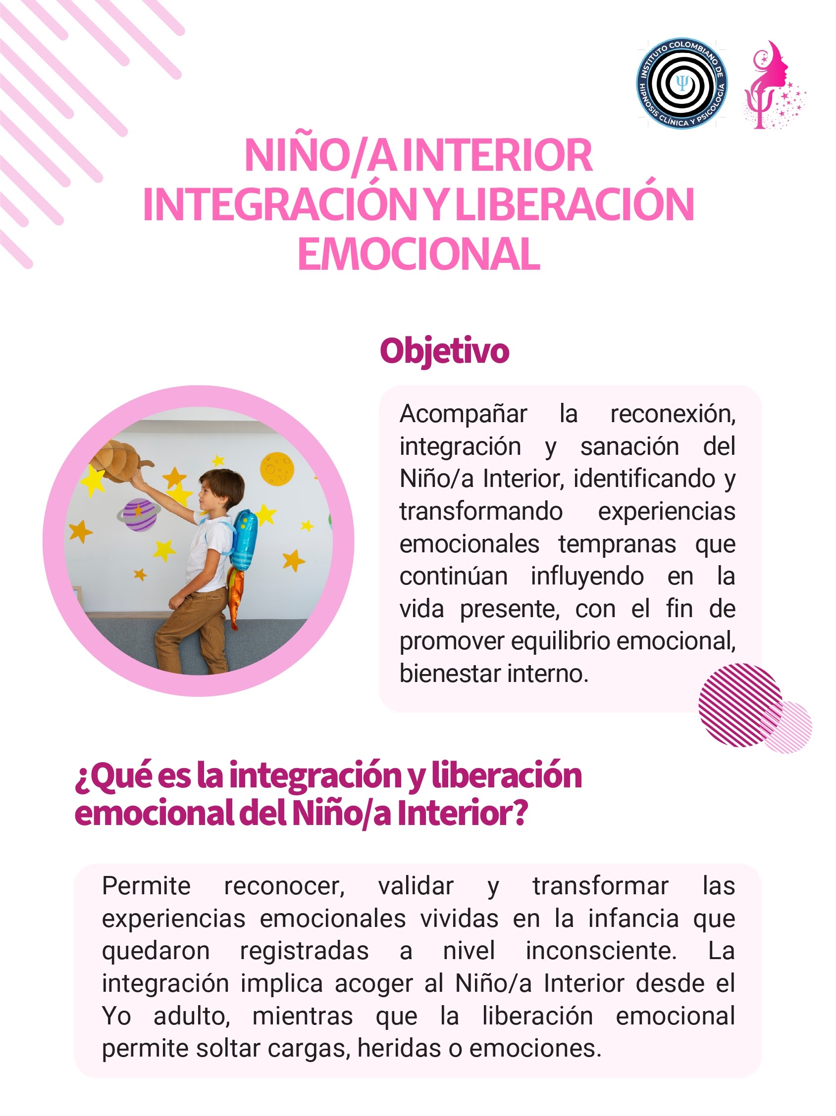 Permite reconocer, validar y transformar las experiencias emocionales vividas en la infancia que quedaron registradas a nivel inconsciente. La integración implica acoger al Niño/a Interior desde el Yo adulto, mientras que la liberación emocional permite soltar cargas, heridas o emociones.