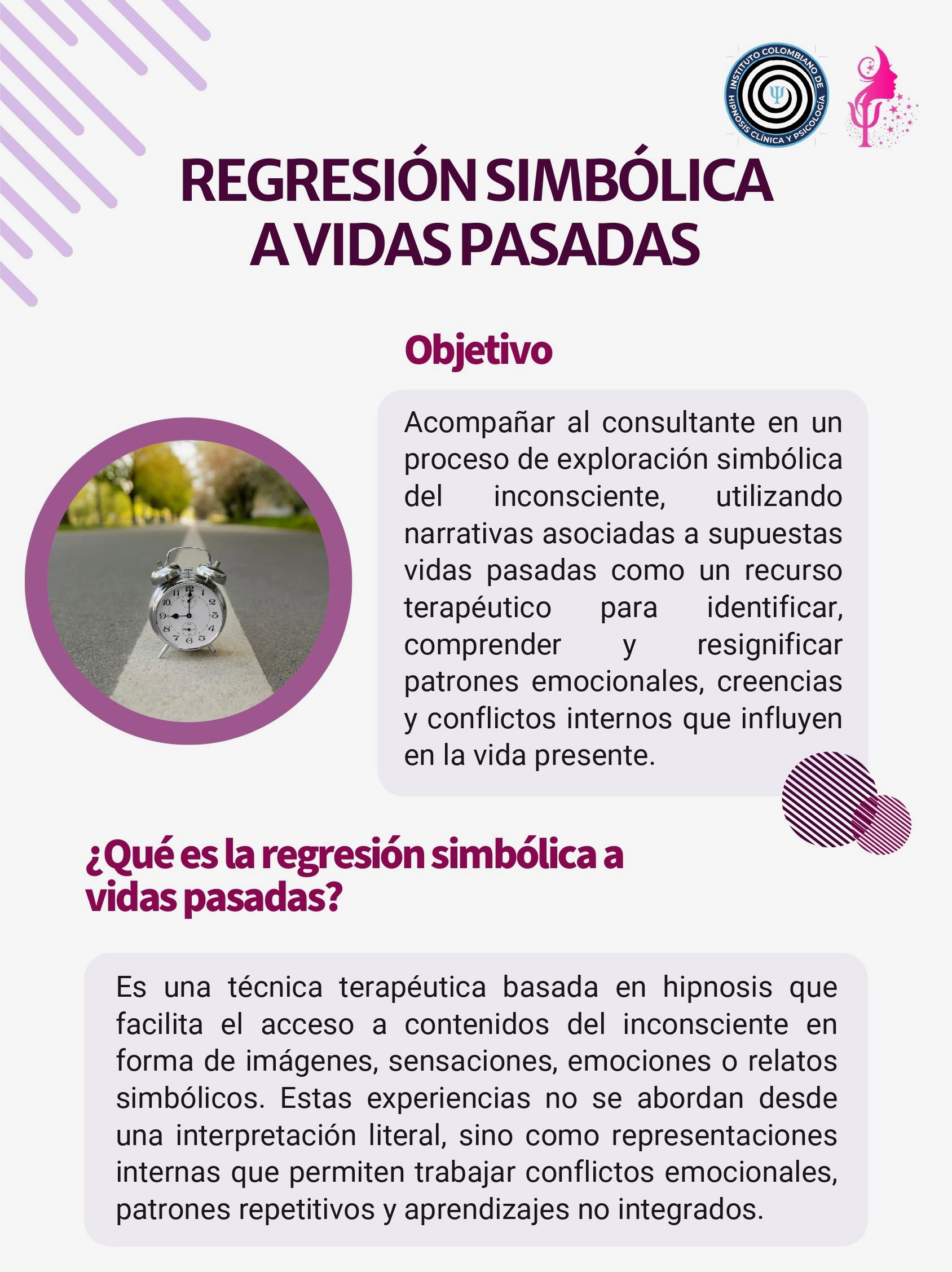 Acompañar al consultante en un proceso de exploración simbólica del inconsciente, utilizando narrativas asociadas a supuestas vidas pasadas como un recurso terapéutico para identificar, comprender y resignificar patrones emocionales, creencias y conflictos internos que influyen en la vida presente.