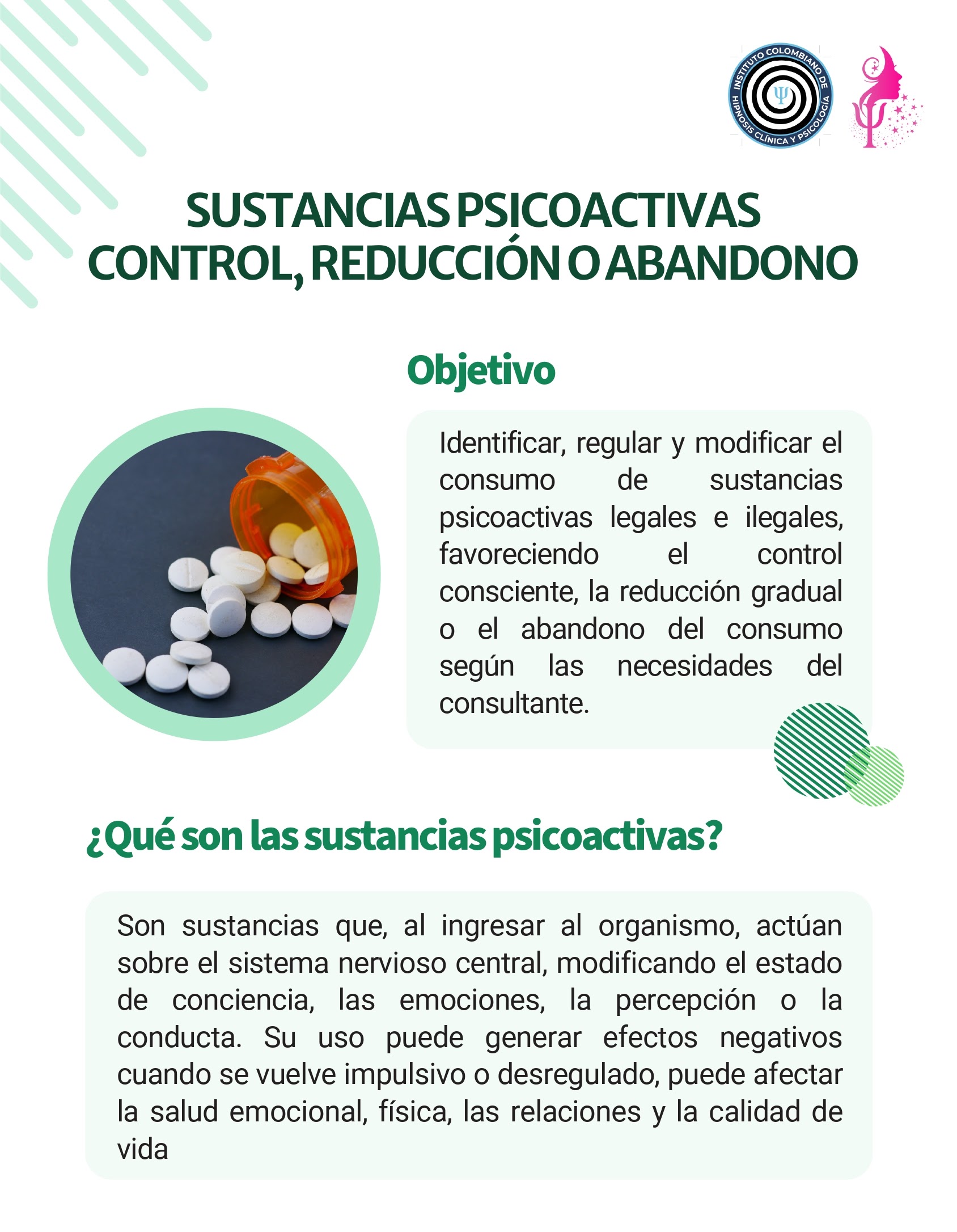 Identificar, regular y modificar el consumo de sustancias psicoactivas legales e ilegales, favoreciendo el control consciente, la reducción gradual o el abandono del consumo según las necesidades del consultante.